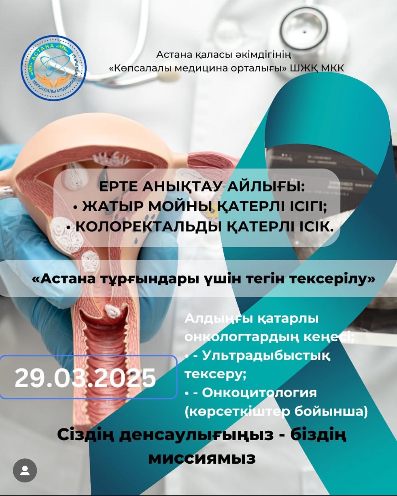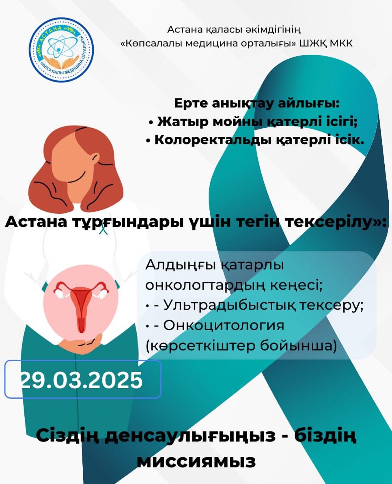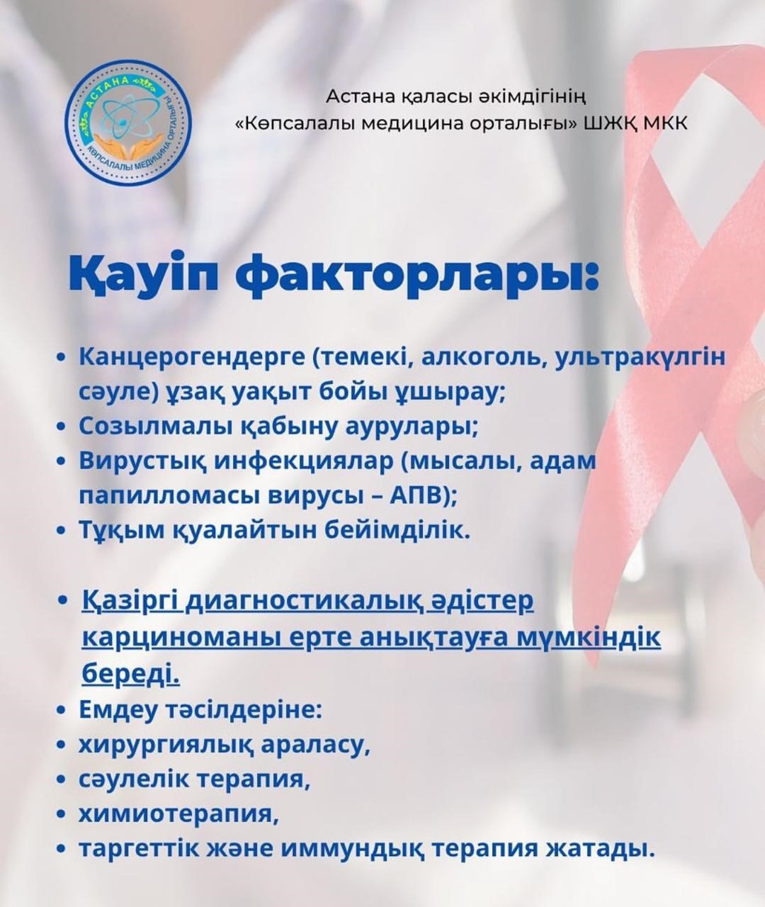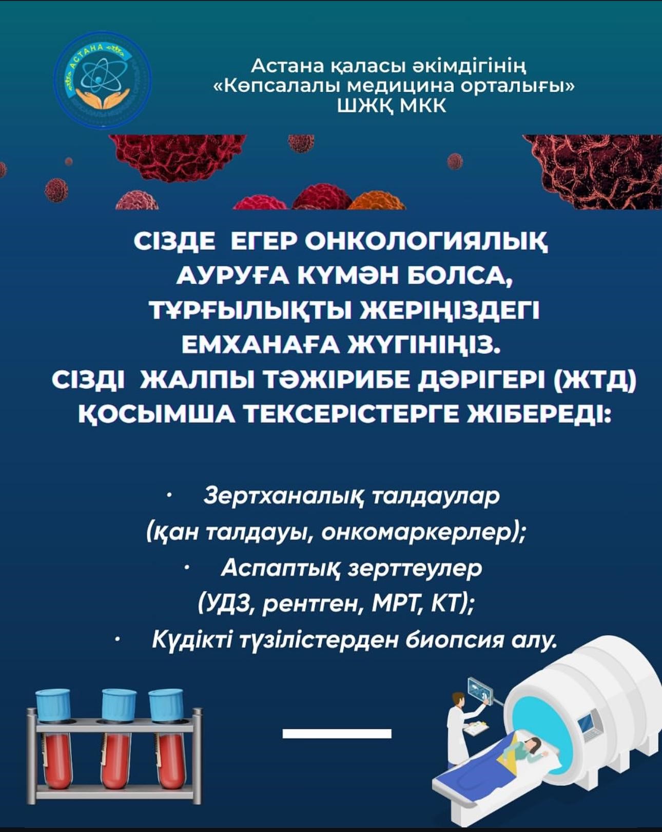Жол картасы” бұйрығын жүзеге асыру мақсатында ,өкпе обыры,,қуық асты обыры,ұйқы без обыры туралы хабарларболу айлығының шеңберінде өлім-жетімді төмендету мақсатында Астана қаласы әкімдігінің ШЖҚ “Көпсалалы медицина орталығы МКК онкохирург дәрігерлердің қатысуымен 23 қарашада сағат 09.00-13.00 дейін қауіп факторы туралы ақпараттандыруды арттыру,өкпе,қуық асты,ұйқы безі обырының алдын алу және бастапқы диагностикасы бойынша Ашық есік күнін өткізеді.Ерте диагностика және алдын алуға тексеру ТЕГІН! Астана қаласы,Манаса 17 көшесі,Көпсалалы медицина орталығының емханасы